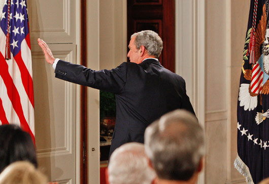 北京時間2009年1月16日,布什在白宮進行告別演說后,揮手告別。