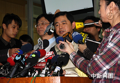 1月19日,臺北地方法院首次開庭審理前臺灣地區(qū)領(lǐng)導人陳水扁家弊案。傳訊陳水扁到地院準備程序庭。圖為庭審后陳水扁委任律師鄭文龍(左三)、石宜琳(左二)舉行記者會。中新社記者 陳立宇 攝