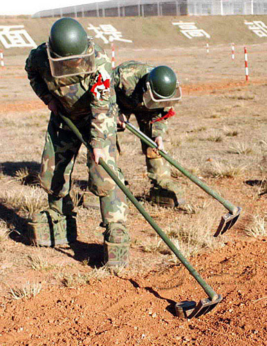 多功能掃雷耙是我掃雷一線人員在實地掃雷過程中發(fā)明的。其發(fā)明者從豬八戒的釘耙開始琢磨:地雷通常采用壓發(fā)裝置起爆,達(dá)到殺傷目的,而從側(cè)面受力則不會引爆。如果有類似的釘耙,就能把地雷鉤出!岸喙δ軖呃装摇本褪腔诖税l(fā)明的。該掃雷耙看似簡單,但它具有排雷簡單,實用,輕便,制造成本低等特點。