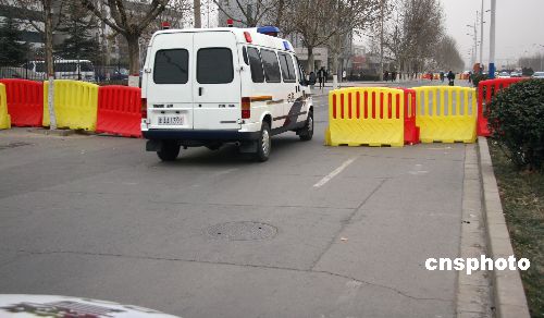 圖為當日上午,法院用紅、黃色的塑料隔離墻代替警戒線,嚴格控制車輛出入。