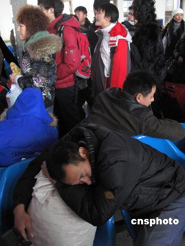 1月23日,一批批的旅客從北京站登車回鄉(xiāng)過(guò)農(nóng)歷已丑年(牛年)的春節(jié)。一名辛苦一年的壯年民工,在候車大廳等車中,提早進(jìn)入了新春的夢(mèng)鄉(xiāng)。為回鄉(xiāng)過(guò)農(nóng)歷已丑年(牛年)的春節(jié),許多在北京的旅客,早早離開(kāi)臨時(shí)居所,在車站休息。當(dāng)日是中國(guó)春運(yùn)第13天,中國(guó)客流最高峰已經(jīng)到來(lái),中國(guó)鐵路共開(kāi)行臨客754列,其中直通臨客393列。中新社發(fā) 鄒憲 攝