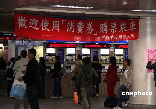 圖為臺北車站掛出的使用消費券可購火車票的條幅。中新社發(fā) 陳立宇 攝