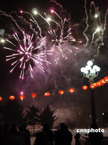 1月25日晚,農(nóng)歷除夕,中國兵器工業(yè)集團(tuán)齊齊哈爾建華公司在廣場舉行迎春秧歌焰火晚會。中新社發(fā) 王云龍 攝