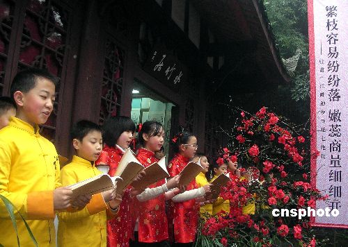 圖為來自成都草堂小學的百名小詩童齊誦杜甫與高適唱和的詩作,一表心中敬意。中新社發(fā) 楊杰 攝