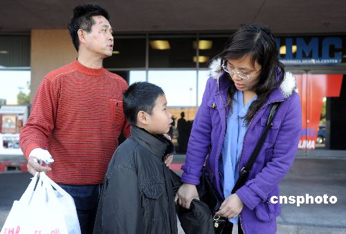 當?shù)貢r間2月1日下午2時左右,遭遇車禍的吳守桂(左)、包瑞華(右)夫婦帶著八歲的兒子吳雙走出拉斯維加斯大學醫(yī)療中心(UMC),乘車前往酒店。吳守桂說,他們現(xiàn)在最大的心愿就是盡快回國,好好調(diào)整心理,繼續(xù)療傷。一月三十日下午,一輛載有中國游客的旅游車在美國亞歷桑那州發(fā)生車禍,造成七死十傷。吳守桂稱自己是不幸中的萬幸,一家三口是所有乘客中傷勢最輕的,夫婦倆昨天就出院了,今天八歲的兒子也順利出院。中新社發(fā) 張煒 攝