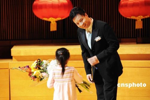 熱情的華盛頓“小粉絲”走上舞臺(tái)向閻維文獻(xiàn)花。