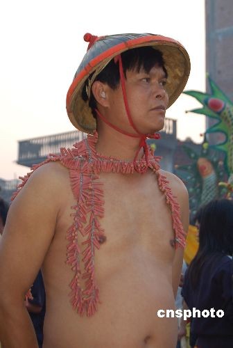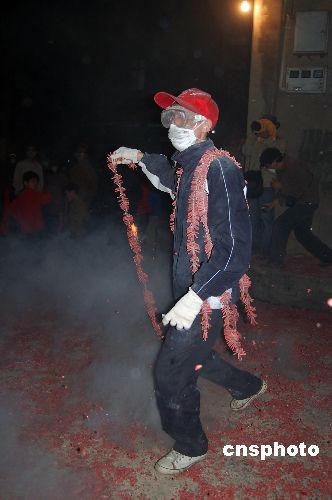 廣西賓陽“炮龍節(jié)”上全副武裝的“炸龍人”。