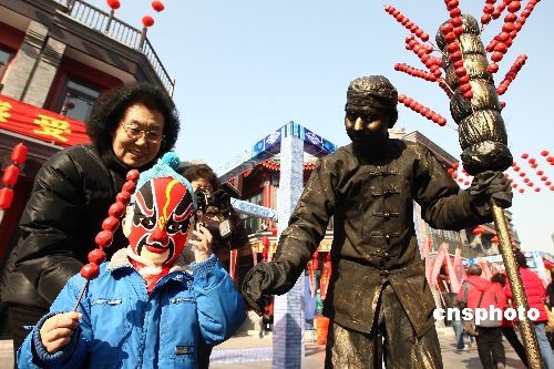 元宵節(jié)來臨,北京前門大街舉行民間花會(huì)踩街活動(dòng),借此宣告修繕一新的前門大街正式開街。踩街是一種中國傳統(tǒng)民間民俗藝術(shù)表演形式,類似國外的花車游行,表演隊(duì)伍邊行進(jìn)邊表演,百姓沿途觀看。圖為面戴京劇臉譜的男孩和真人扮演的“銅人”雕塑。中新社發(fā) 杜洋 攝
