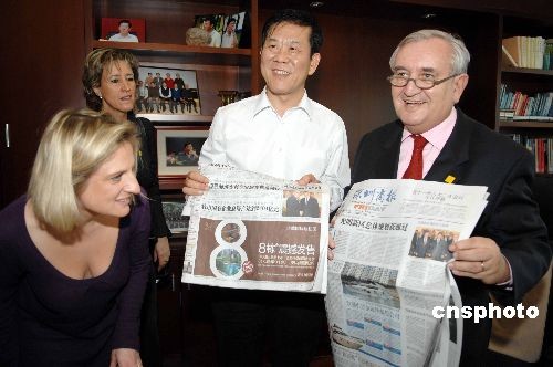 2月13日,法國前總理拉法蘭率領(lǐng)的法中友好代表團(tuán)一行參觀深圳市容市貌,包括地王大廈、博物館、市人大、中興通訊等,并題詞:登高望遠(yuǎn),利于友誼;未來在何方,也許就在這里。圖為拉法蘭喜閱中文報(bào)紙。中新社發(fā) 陳文 攝