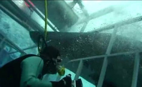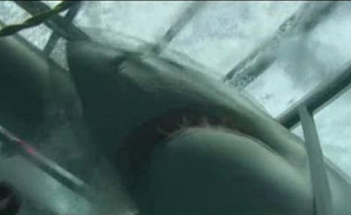 這一令人驚恐的事件是在兩名潛水者參加旅游公司所組織的“極限鯊魚深潛體驗游”時發(fā)生的,他們當時正在觀看那頭體重達2噸的大白鯊捕食金槍魚。一頭長4.5米的大白鯊?fù)蝗幌蚪饘傧溆蝸,大白鯊的頭部穿過了鐵欄桿,將鐵欄桿撞斷,兩名潛水者不得不趕緊逃生。