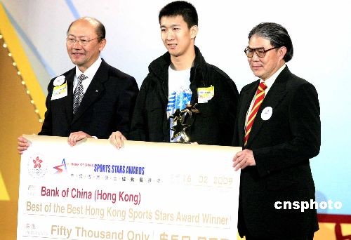 二月十六日,“2008中銀香港杰出運動員選舉”得獎結果在香港會展中心舉行的頒獎典禮上揭曉。圖為國際奧委會委員、中國香港體育協(xié)會暨奧林匹克委員會會長霍震霆(右一)等為“中銀香港星中之星香港杰出運動員大獎”獲獎者蘇樺偉(中)頒獎。中新社發(fā) 張勤 攝