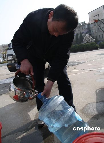 2月21日,江蘇省鹽城市各主干道上,消防車輛正為市民輸送安全用水,確保鹽城市民能夠安心喝上未被污染的自來水。由于水廠受酚類化合物污染,鹽城市區(qū)2月20日出現(xiàn)大面積停水,居民生活受到較大影響。造成本次停水的水源地污染原因已經(jīng)確認,偷排污水的鹽城標新化工有限公司被責令關閉,法人代表等相關責任人被采取強制措施。圖為鹽城市市委黨校內(nèi)前來取水的市民用純凈水桶取水。中新社發(fā) 童盛 攝