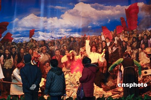 2月24日,“西藏民主改革50年大型展覽”在北京民族文化宮開幕。展覽分為和平解放西藏,平息武裝叛亂,西藏的民主改革,50年來統(tǒng)一與分裂、進(jìn)步與倒退的斗爭(zhēng),經(jīng)濟(jì)社會(huì)發(fā)展和人權(quán)事業(yè)的巨大成就等5部分,包含500多幅圖片和180多件實(shí)物、文獻(xiàn)檔案。展覽將持續(xù)一個(gè)半月。展覽再現(xiàn)獲得解放的農(nóng)奴焚燒契書的場(chǎng)景,吸引不少觀眾。中新社發(fā) 盛佳鵬 攝