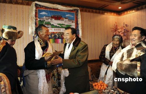 2月25日,中國(guó)藏歷年初一,西藏自治區(qū)黨委書(shū)記張慶黎冒著風(fēng)雪來(lái)到拉薩市城關(guān)區(qū)納金鄉(xiāng)嘎巴村拜年,與村民多布杰一家人共慶藏歷新年。中新社發(fā) 廖攀 攝
