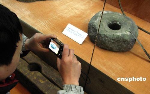 2月25日,在北京民族文化宮舉辦的《西藏民主改革50年大型展覽》免費向民眾開放。圖為展覽上展出的舊西藏朗子轄監(jiān)獄的刑具挖眼用的石帽和刀子。中新社發(fā) 鄒憲 攝