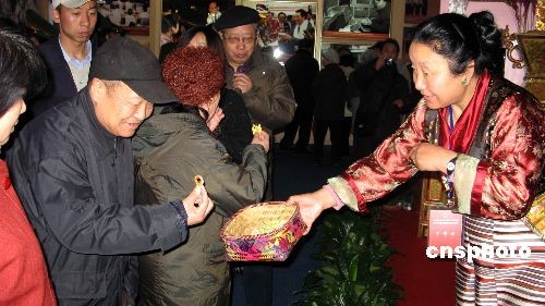2月25日,在北京民族文化宮舉辦的《西藏民主改革50年大型展覽》免費(fèi)向民眾開放,來自西藏的藏族同胞現(xiàn)場向觀眾發(fā)放藏族小麻花等禮品。中新社發(fā) 鄒憲 攝