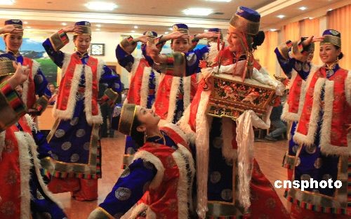 2月25日是藏歷新年初一,甘肅省甘南藏族自治州合作地區(qū)的藏族官員和民眾匯集甘南飯店舉行聯(lián)歡會(huì),慶祝新年。圖為甘南州歌舞劇院表演舞蹈《祝福吉祥》。中新社發(fā) 殷春永 攝