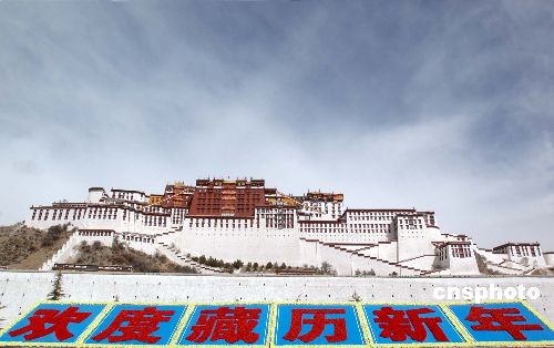 藏歷新年,在西藏拉薩宏偉的布達拉宮下,用紅色花朵拼成的“歡度藏歷新年”字幅,給古城拉薩增添了喜慶祥和的氛圍。中新社發(fā) 周波 攝