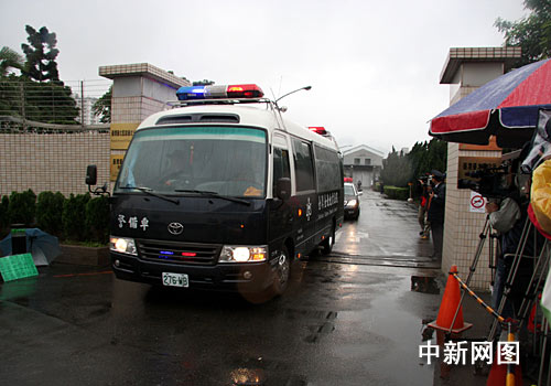 圖為今天早上八時(shí)三十五分許,押著陳水扁的囚車開出臺北看守所,前往地院出庭。 中新社記者 陳立宇 攝