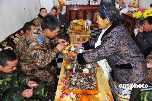 2月25日藏歷大年初一,海拔5374米的駐藏空軍甘巴拉雷達(dá)站官兵,受到駐地藏民央金一家的盛情邀請,與他們一家五口共度藏歷新年。圖為60多歲的老阿媽請官兵們品嘗自已親手制做的土特產(chǎn)。中新社發(fā) 郭超英 攝