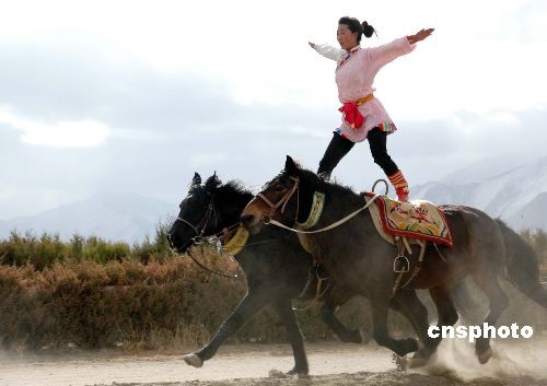 2月27日,中國藏歷年初三,在拉薩市北郊的賽馬場,傳統(tǒng)賽馬與馬術(shù)表演活動(dòng)隆重舉行,身懷絕技的騎手們?yōu)槌汕先f的觀眾表演了精彩絕倫各種節(jié)目。中新社發(fā) 周波 攝
