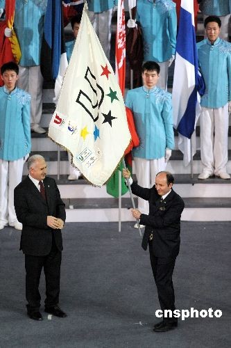 國際大體聯(lián)會旗被轉(zhuǎn)交到下屆大冬會主辦城市——土耳其埃爾祖魯姆市代表手中。中新社發(fā) 姚庭山 攝