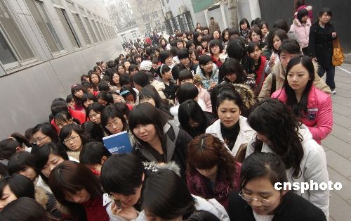 2009年3月4日,前來應聘的女大學生擠滿了會場!叭恕眹H婦女節(jié)前夕,北京市2009年女大學生專場招聘會在北京市畢業(yè)生就業(yè)市場舉辦,吸引了數(shù)萬女大學生到場應聘。中新社發(fā) 吳芒子 攝