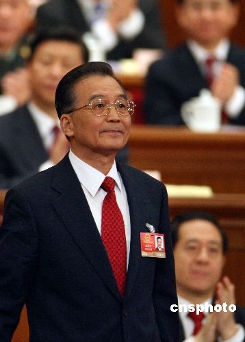 3月5日上午,十一屆全國人大二次會議在北京人民大會堂開幕,國務(wù)院總理溫家寶作《政府工作報告》,代表們多次報以熱烈掌聲。中新社發(fā) 任晨鳴 攝