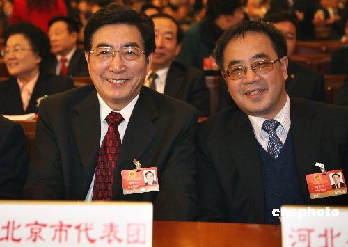 3月5日上午,十一屆全國人大二次會(huì)議在北京人民大會(huì)堂開幕,先后在西藏工作過的的北京市市長(zhǎng)郭金龍(左)、河北省省長(zhǎng)胡春華出席大會(huì)時(shí)比鄰而坐。中新社發(fā) 任晨鳴 攝