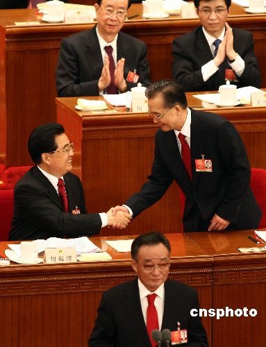 3月5日上午,十一屆全國人大二次會議在北京人民大會堂開幕,國務(wù)院總理溫家寶作《政府工作報告》后,與國家主席胡錦濤握手。中新社發(fā) 杜洋 攝