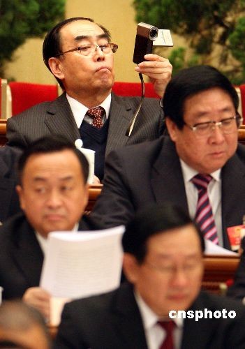3月5日上午,十一屆全國(guó)人大二次會(huì)議在北京人民大會(huì)堂開(kāi)幕,一名在主席臺(tái)最高層就座的主席團(tuán)成員 “居高臨下”拍攝會(huì)議盛況。中新社發(fā) 任晨鳴 攝