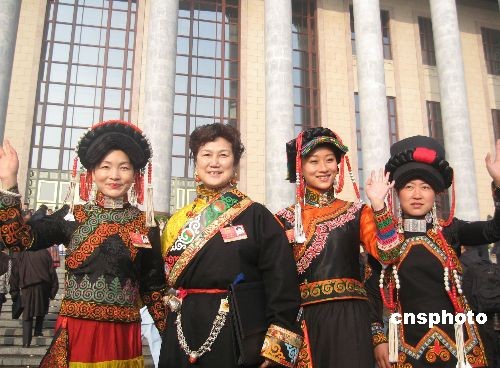5日上午9時(shí),十一屆全國(guó)人大二次會(huì)議在北京開幕。圖為身著民族服裝出席大會(huì)的四川女代表。中新社發(fā) 肖青 攝