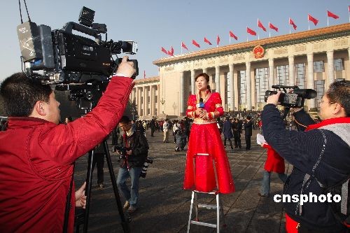 3月5日,十一屆全國(guó)人大二次會(huì)議在北京人民大會(huì)堂隆重舉行。大會(huì)吸引了近4000名中外記者前來(lái)采訪報(bào)道。圖為內(nèi)蒙古電視臺(tái)的記者在大會(huì)堂外做現(xiàn)場(chǎng)報(bào)道。中新社發(fā) 李松 攝