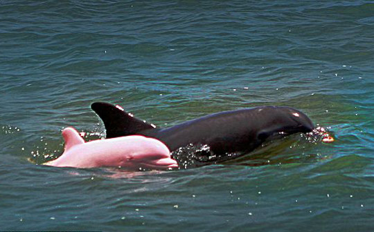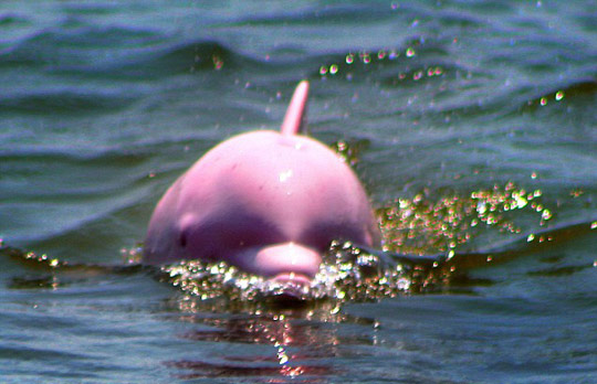 粉紅色海豚在水中嬉戲。拍攝地點(diǎn)是在美國(guó)路易斯安那州的加爾卡修湖,拍攝者是當(dāng)?shù)氐囊幻L(zhǎng),他說(shuō)這只粉紅色的小寬吻海豚甚至還擁有淡紅色的眼睛。這只海豚也可能是世界上唯一一只粉紅色的寬吻海豚。