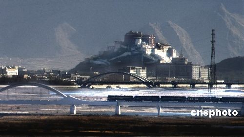 3月9日,青藏鐵路上的列車駛過拉薩城西側的拉薩河大橋。據(jù)悉,有關方面爭取今年“五一”前開行青藏鐵路五星級豪華列車。目前,已經(jīng)有不少旅行社聯(lián)系青藏鐵路五星級列車,客源情況很好。中新社發(fā) 廖攀 攝