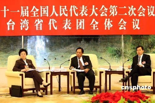 3月9日,全國(guó)人大臺(tái)灣省代表團(tuán)在人民大會(huì)堂舉行全體會(huì)議,審議全國(guó)人大常委會(huì)委員長(zhǎng)吳邦國(guó)全國(guó)人大常委會(huì)工作報(bào)告。圖為全國(guó)臺(tái)聯(lián)會(huì)長(zhǎng)梁國(guó)揚(yáng)代表(中),全國(guó)臺(tái)聯(lián)理事魏麗惠(左)和臺(tái)盟中央副主席陳蔚文出席會(huì)議。中新社發(fā) 杜洋 攝