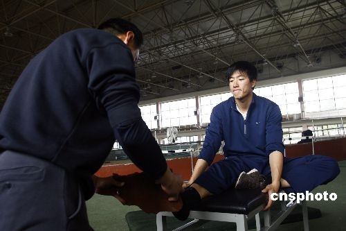 3月10日上午, 劉翔在上海莘莊基地開始進行正式訓練,在訓練間隙,孫海平教練用一塊海綿來幫助訓練劉翔右腳的靈敏性。孫海平教練表示:由于劉翔的傷勢剛剛恢復,右腳踝關節(jié)力量還不夠,用海綿訓練是為了增加劉翔右腳踝的靈活性!敝行律绨l(fā) 湯彥俊 攝
