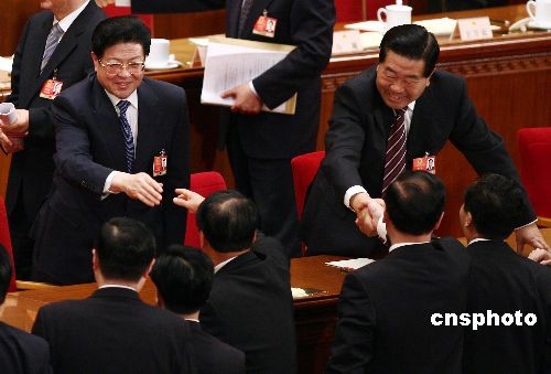 3月10日,全國政協(xié)主席賈慶林、全國人大常委會副委員長王兆國在十一屆全國人大二次會議第三次全體大會結(jié)束后和代表握手。中新社發(fā) 杜洋 攝