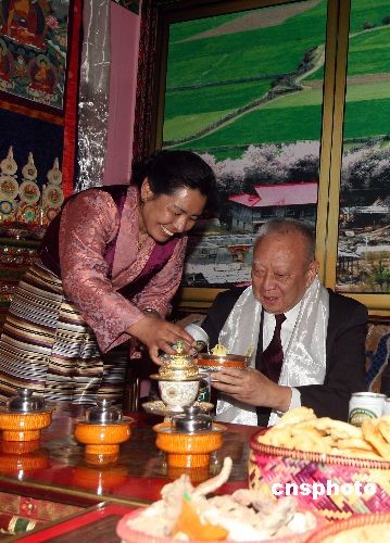 3月11日,參加“兩會(huì)”的全國(guó)政協(xié)副主席董建華,前往北京民族文化宮參觀“西藏民主改革50年展覽”。圖為董建華在參觀時(shí)感受藏族民俗。中新社發(fā) 張宇 攝
