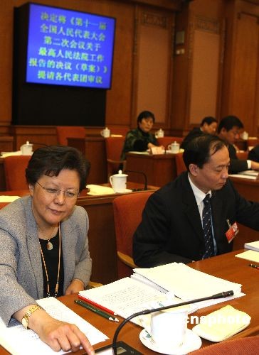 3月12日上午,十一屆全國(guó)人大二次會(huì)議第三次主席團(tuán)會(huì)議在北京人民大會(huì)堂舉行。會(huì)議經(jīng)過(guò)表決,決定將關(guān)于全國(guó)人大常委會(huì)工作報(bào)告的決議草案、關(guān)于最高人民法院工作報(bào)告的決議草案、關(guān)于最高人民檢察院工作報(bào)告的決議草案提請(qǐng)各代表團(tuán)審議。圖為主席團(tuán)成員范徐麗泰按表決器。中新社發(fā) 任晨鳴 攝