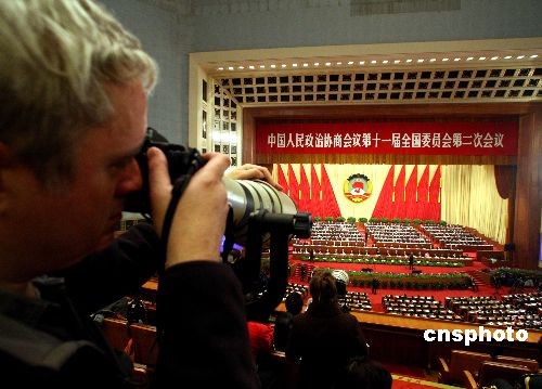 3月12日,全國政協(xié)十一屆二次會議舉行閉幕大會。圖為外國記者在會場拍照。中新社發(fā) 宋吉河 攝