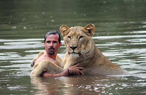 圖:人與母獅一同在河中洗澡(2)