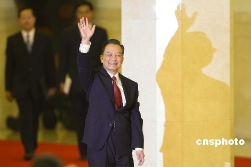 3月13日上午,溫家寶總理在十一屆全國人大二次會議閉幕后舉行中外記者招待會,出場時面帶微笑。 中新社發(fā) 盛佳鵬 攝