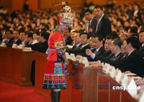 3月13日上午,第十一屆全國人民代表大會第二次會議在北京人民大會堂舉行閉幕會。會前,來自重慶的苗族女代表李小燕逐一請坐在前排的各省省長們在紀(jì)念冊上簽名。中新社發(fā) 任晨鳴 攝