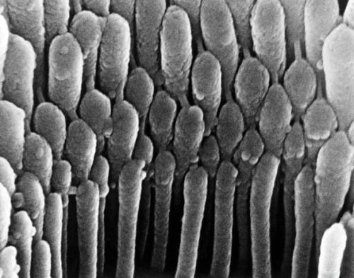 耳毛細(xì)胞:這張圖片看起來(lái)好像是在耳朵里面對(duì)耳毛細(xì)胞進(jìn)行近距離觀(guān)察時(shí)拍攝的。耳毛細(xì)胞的主要功能是發(fā)現(xiàn)對(duì)聲震作出反應(yīng)時(shí)產(chǎn)生的機(jī)械運(yùn)動(dòng)。