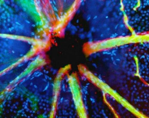 從視神經(jīng)中伸出的血管:這張照片顯示的是血管從黑色視盤中伸出。視盤是個盲點(diǎn),因為視網(wǎng)膜的這個區(qū)域沒有光感細(xì)胞,視神經(jīng)和視網(wǎng)膜血管從眼睛后面的這個部位伸出去。