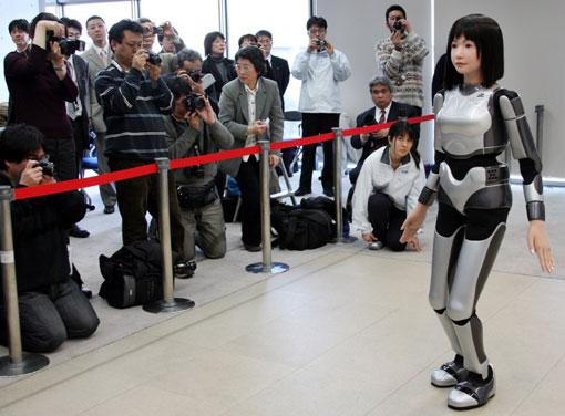 日本科學(xué)家最近展示了一名機(jī)械黑發(fā)美女,她不僅能說話,可行走具有豐富的表情,還能在舞臺上走貓步。這個外表亮麗的類人機(jī)器人名為“HRP-4C”,它的體內(nèi)裝有30個發(fā)動機(jī),能夠幫助它行走和移動手臂,面部的8個發(fā)動機(jī)則賦予它憤怒、驚訝等表情。