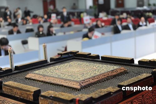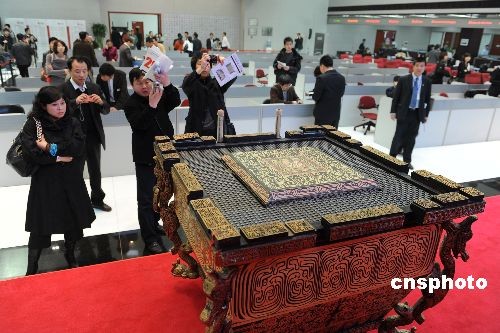 3月18日,2008北京第29屆奧運會開幕式演出道具“缶”最后一場專場拍賣在北京產(chǎn)權(quán)交易所完美落槌。22個標的共320個缶以總價4138萬元拍出。此外10個標的共200幅竹簡以總價637.5萬元成交。共有132家單位和個人參與了此次競買,單個“奧運缶”的成交均價12.93萬元,超過第一批“奧運缶”成交均價一倍有余,單個“竹簡”成交均價3.18萬元。中新社發(fā) 遠舟 攝