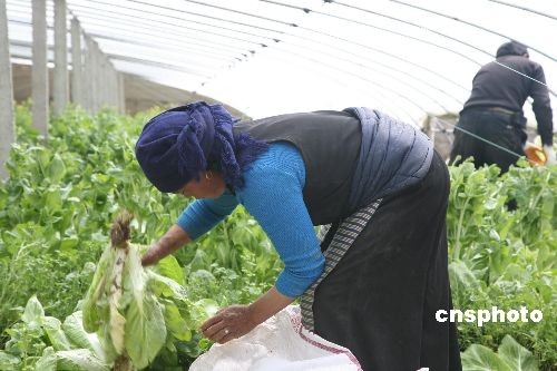 近年來(lái),用溫室大棚種植蔬菜在西藏日益推廣。在強(qiáng)烈的日光照射下,大棚內(nèi)溫暖如春。就是在青黃不接的冬春時(shí)節(jié),大棚內(nèi)都可生長(zhǎng)各種新鮮蔬菜供應(yīng)市場(chǎng)。圖為3月17日拉薩近郊曲水縣的一對(duì)藏族夫婦在收獲大白菜。中新社發(fā) 王林 攝