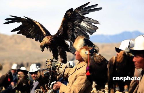 3月20日,位于新疆西部天山南脈腹地的阿合奇縣舉辦第二屆獵鷹節(jié),當?shù)乜聽柨俗巫迕癖娋奂谠摽h賽馬場,展示自家馴養(yǎng)的上百只獵鷹。當?shù)乜聽柨俗巫羼Z養(yǎng)獵鷹有著悠久的歷史,至今仍完整保留著原始的馴養(yǎng)方式,被譽為中國“獵鷹之鄉(xiāng)”,當?shù)乜聽柨俗巫逡脖蛔u為“鷹王”。他們在放牧的同時,經(jīng)常騎馬到高達近百米的高山頂上,將自己馴養(yǎng)的獵鷹放飛。中新社發(fā) 劉新 攝